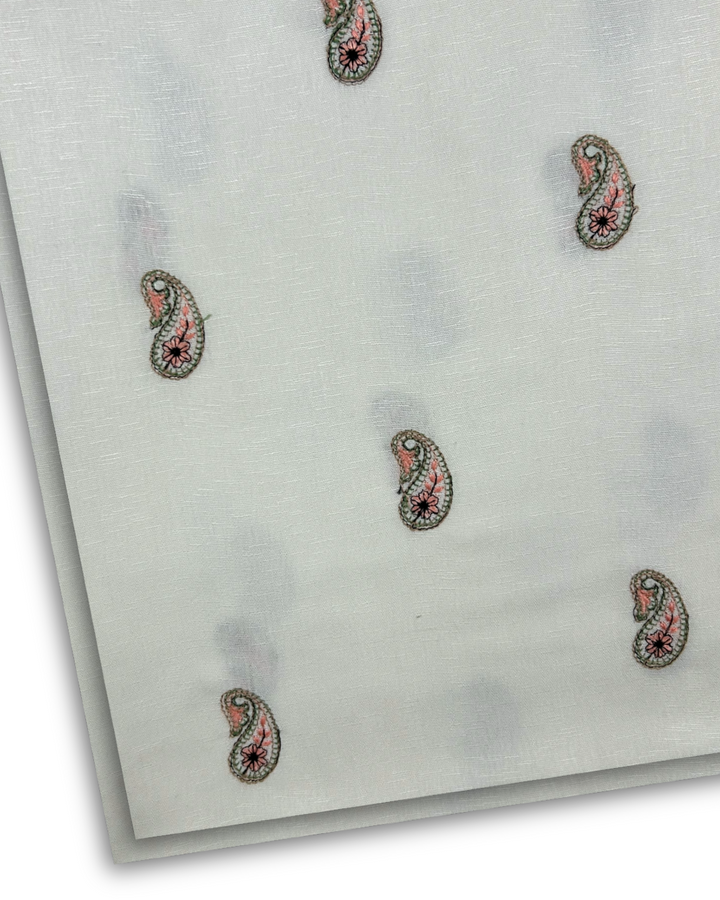 The allover trendy motif embroidery is done on Karandi on state of the art Multihead Embroidery machines.