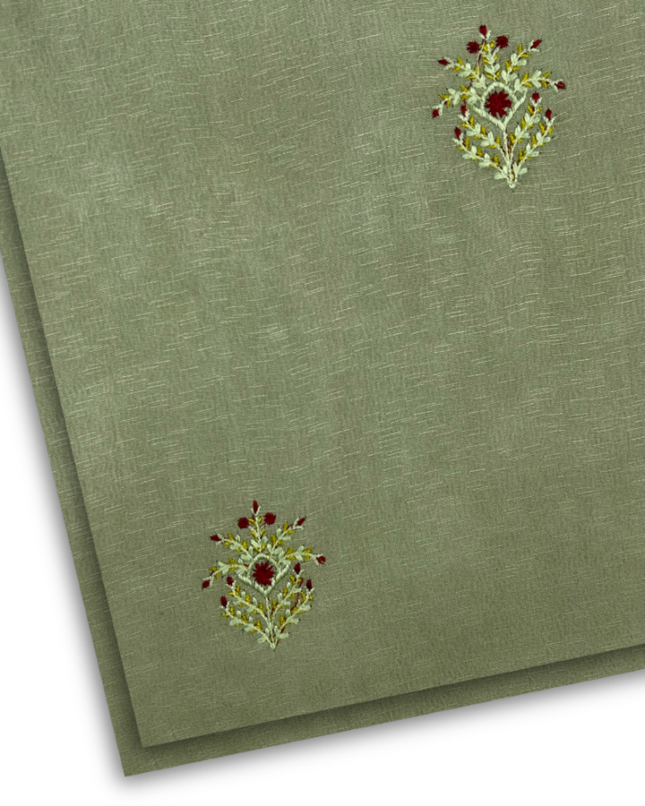 The allover trendy motif embroidery is done on Karandi on state of the art Multihead Embroidery machines.