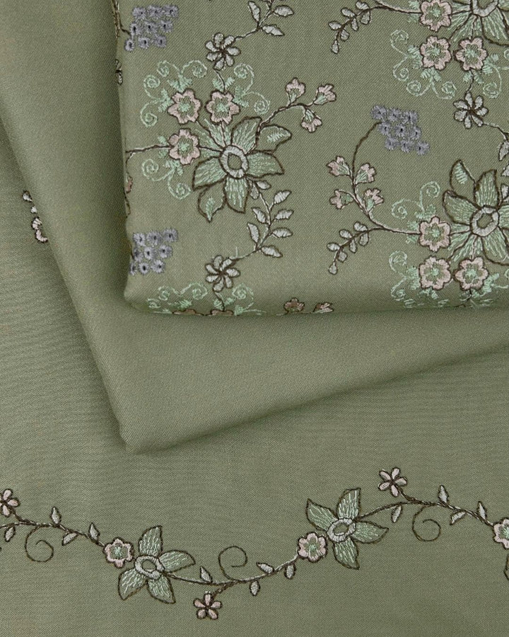 This elegant 3-piece set features a 2.5-meter Alpine embroidered shirt paired with 2.5 yards of plain Alpine trousers, delivering a balanced and sophisticated look. Completing the ensemble is a 2.5-yard shawl adorned with detailed Alpine embroidery along the border, adding a refined touch. Crafted to provide comfort and style, this set is ideal for formal occasions, offering a harmonious blend of intricate embroidery and classic fabric.