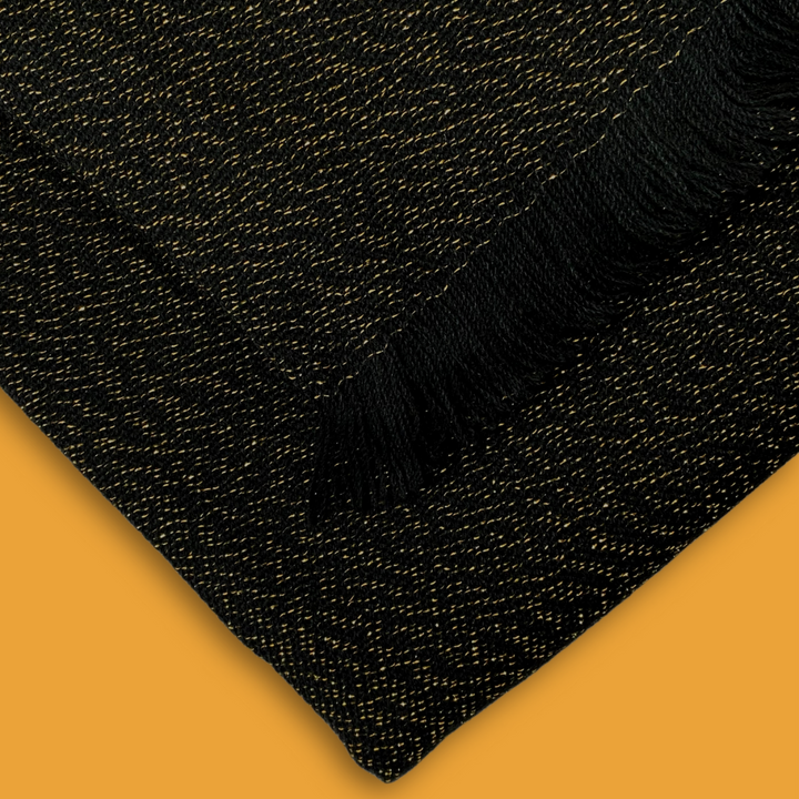Wrap yourself in timeless elegance with our Moonling Acrywool Shawl. Crafted with a soft blend of acrylic and wool, this shawl features a sleek black base interwoven with subtle golden threads that create a luminous, moonlit effect. The fine texture and delicate fringed edges add a graceful touch, making it perfect for both casual drapes and evening ensembles. Lightweight yet warm, it’s an ideal companion for chilly evenings, festive gatherings, or a refined everyday statement.